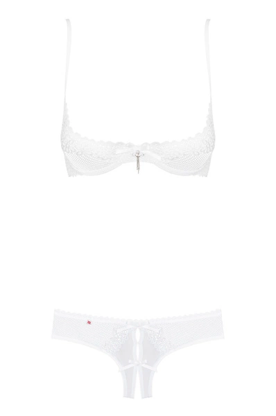 Alabastra is a lingerie set that combines classic white with a bold, modern cut. The underwired half-cup bra enhances the bust and provides secure support, while floral lace adds lightness and a romantic vibe. The open thong introduces a daring accent that ignites the imagination. Adjustable straps and hook-and-eye closure ensure a customized fit, while a sparkling embellishment between the cups draws the eye. The soft, stretchable fabric guarantees comfort and a truly sensual experience.