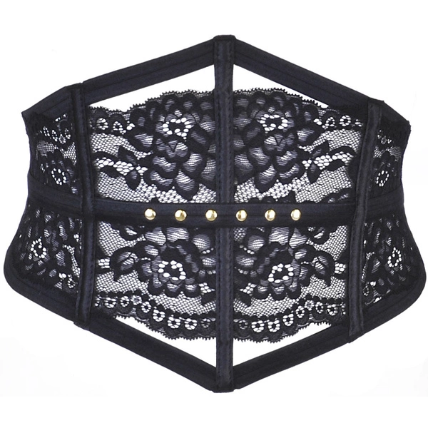 Zjawiskowy, czarny jak upojna noc pas wykończony elegancką koronką to dodatek na każdą okazję. Wbudowane fiszbiny z przodu i po bokach zapewniają stabilność noszenia i brak efektu przesunięcia na ciele. Ponadto kilka ćwieków w kolorze złotym nadaje błysku całości. Z tyłu potrójne paski łączą się na zapięciu w postaci dwurzędowej haftki.
