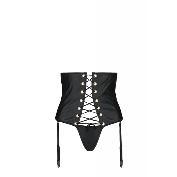 CELIN SET WITH OPEN BRA Black Passion is a bold lingerie set that combines striking design with a carefully refined cut. The leather-look, lace-up high-waisted garter belt dramatically accentuates the waist, giving the silhouette a strong and sensual character. This is a statement piece that sparks imagination and draws attention.