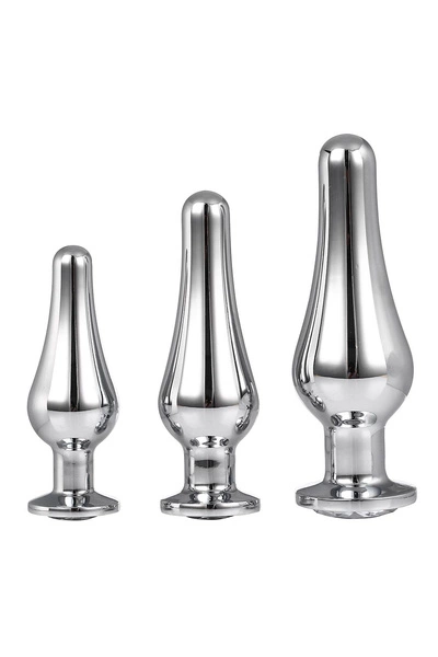 The Gleaming Love Pleasure Set Silver includes three different sizes, allowing for gradual exploration of new pleasures. Each plug is adorned with a gleaming crystal, adding a sensual sparkle to every moment. Their ergonomic shape ensures easy insertion and stability, allowing you to fully focus on discovering pleasure.