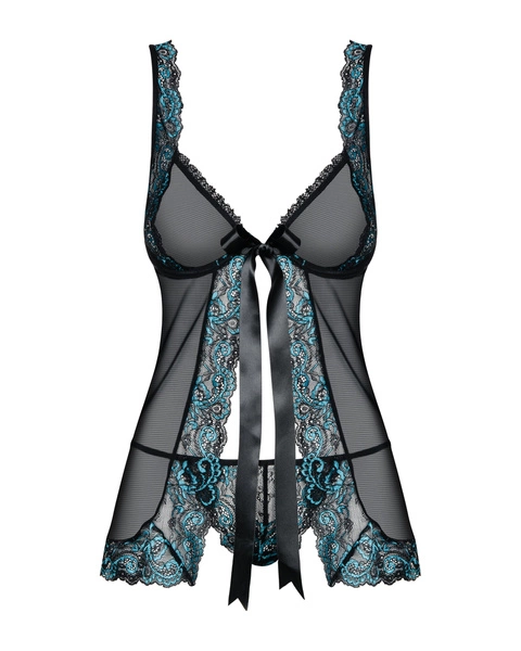 Amanta is a charming lingerie set in an intense turquoise shade, combining romantic style with a sexy finish. The camisole is made from airy, sheer mesh, gently enveloping the body, and the lace trims with shimmering threads add a unique character and elegance.