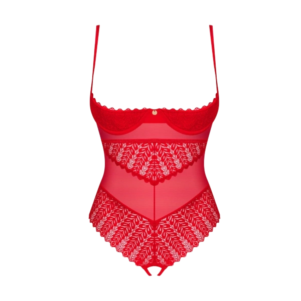 Ingridia bodysuit ignites the senses with its fearless design. The open cups and crotch leave nothing to the imagination, while the striking red paired with lace detailing creates a powerfully seductive look. Underwires with light padding enhance the bust for a flawless presentation. This lingerie celebrates boldness, sensual nature, and feminine confidence.