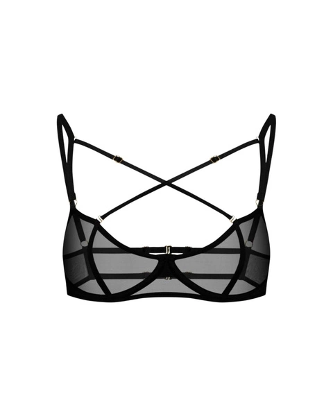 The Daisy bra is the essence of refined sensuality, accentuating feminine curves with remarkable finesse. The transparent mesh gently exposes the breasts, creating an intriguing effect of subtle exposure. Golden elements and decorative straps wrapping around the neckline and back add an elegant, slightly provocative touch, drawing attention and arousing the senses.