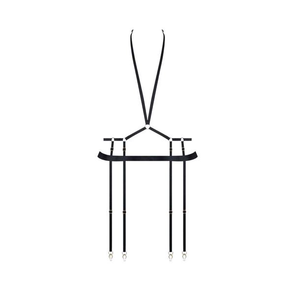 At first glance, it’s clear that Nella is more than just a classic garter belt. The black construction, based on elastic straps, wraps around the body like a body harness, adding a touch of spice to the styling. The combination of deep black with golden accents creates a luxurious effect, making it the perfect complement to both lingerie and evening outfits. This garter belt is ideal for intimate moments, romantic dinners, or elegant outings.