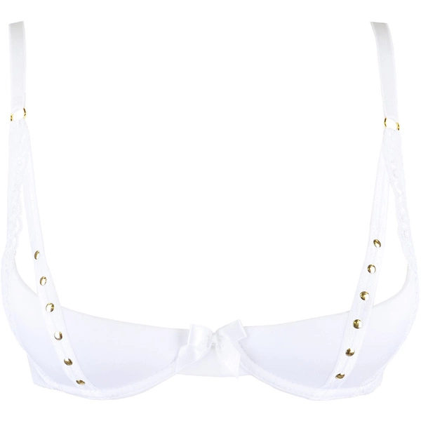 Anielsko biały i zjawiskowy biustonosz typu push-up to świeża propozycja od Axami dla odważnych kobiet lubiących bawić się stylem romantycznym w erotycznej odsłonie. Model posiada regulowane lecz nieodpinane ramiączka, regulatorki są także w kolorze złotym, zapinany na podwójną haftkę, bez fiszbin bocznych.