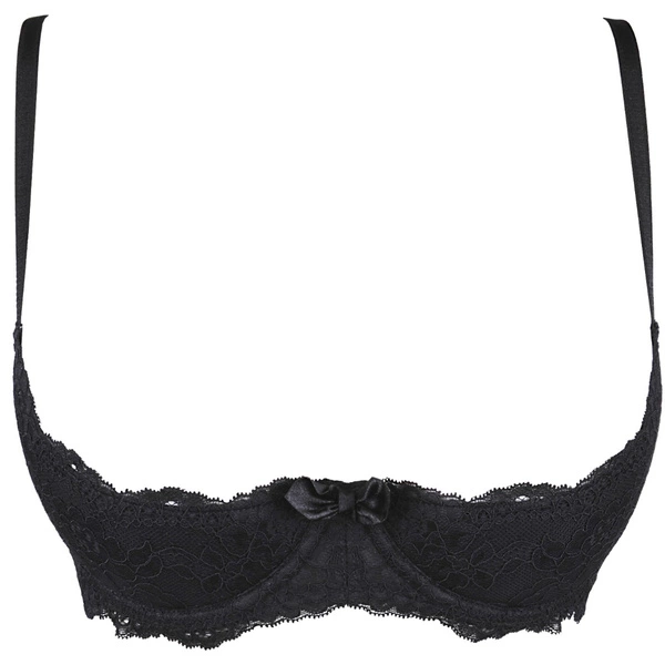 Zachwycający, uwodzicielski, czarny biustonosz peek-a-boo V-9801 przyciągnie spojrzenia fakturą materiału – miękką koronką o przyjemnym wykończeniu i nieodpinaną kokardką między miseczkami. Ramiączka są regulowane lecz nieodpinane, zapięcie na podwójną haftkę. Na plecach koronkowa ozdoba w kształcie skrzydełek. Do kompletu proponujemy stringi V-9818. Brak fiszbin bocznych, brak wypełnień miseczek.