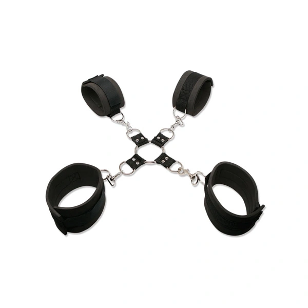 Podstawą zestawu jest solidny metalowy krzyżak, który umożliwia szybkie połączenie mankietów na nadgarstki i kostki w jeden stabilny układ. Takie rozwiązanie pozwala skutecznie ograniczyć ruchy osoby skrępowanej, jednocześnie zachowując prostotę obsługi i pełną koncentrację na napięciu oraz dynamice relacji.