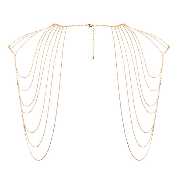 BI Magnifique Metallic chains shoulders and back jewelery to erotyczna biżuteria na ramiona. Całość prezentuje się niezwykle uwodzicielsko i oryginalnie. Dzięki takiej biżuterii będziesz przyciągać spojrzenia i działać na zmysły. Naszyjnik składa się z kilku rzędów łańcuszków, które tworzą piękny, ażurowy wzór na ramionach i plecach. Taki dodatek jest bardzo delikatny, ale tez seksowny. Mało tego, możesz dzięki niemu wyglądać oryginalnie podczas wieczornego wyjścia, a w trakcie intymnych chwil uwodzić.
