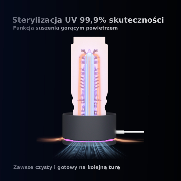 Po użyciu tuleję wystarczy umieścić w stacji dokującej. Gorące powietrze osuszy wnętrze, a światło UV usunie bakterie, zapewniając pełną gotowość do następnego użycia.