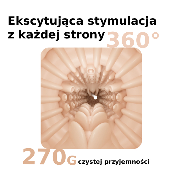 Miękka, elastyczna tuleja o wadze ok. 270 g dopasowuje się do ciała, a gęsty wzór wypustek i rowków zapewnia kompleksową stymulację 360°.