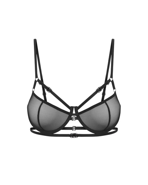 Biustonosz Mimi to połączenie wyrafinowanej elegancji i zmysłowej prowokacji, stworzony dla kobiet, które pragną eksponować swoje atuty i czuć się wyjątkowo w każdej chwili. Wykonany z delikatnej, prześwitującej czarnej siateczki, która subtelnie otula piersi, podkreślając ich naturalny kształt i nadając sylwetce kuszący, nieodparty wdzięk.