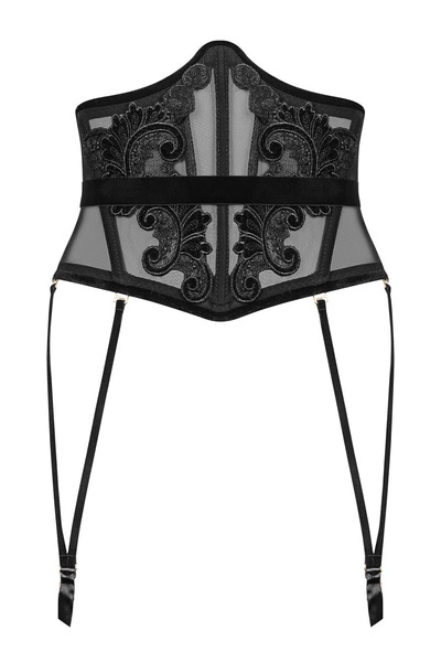 Tiulowy gorset typu Waspie z haftem, szelkami do mocowania pończoch i paskiem z kolekcji Petitenoir.