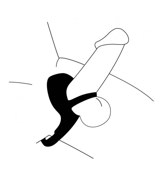 Cockring z poprzeczką oddzielającą penisa i jądra oraz z zatyczką analna w kształcie jajka.