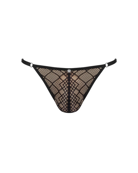 Severio is a thong created for men who value both design and comfort. The semi-sheer fabric with a geometric motif draws the eye, while thin straps and metallic accents give the piece a modern edge. An adjustable waistband allows for a perfect fit, and the silver charm on the front adds a subtle touch of sophistication. The comfortable cut and soft fabric make this model a pleasure to wear.