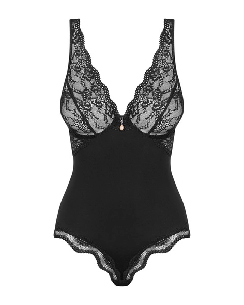 Мереживні акценти огортають тіло легким туманом чуттєвості, тоді як жорсткі чашечки з кісточками дбають про правильне положення бюста. Регульовані бретелі дозволяють точно підлаштуватися під силует, а ретельно профільована нижня частина красиво підкреслює стегна та сідниці. У центральній частині розташована тонка прикраса з перлиною бежевого відтінку, яка додає всьому образу ювелірного шарму.