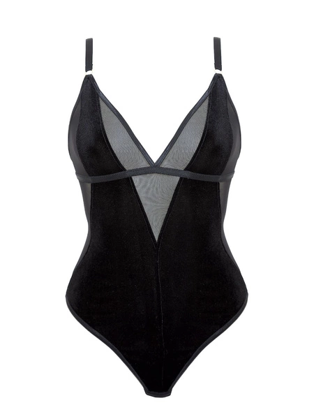 Передня частина боді спроектована так, щоб велюрові панелі закривали груди та живіт, а їхнє розташування оптично стрункішало силует і підкреслювало талію. Верхня частина створена на основі конструкції нашої бестселлерної бралетки Warsaw Night, цього разу в поєднанні з тюлем для повного комфорту та легкості носіння.