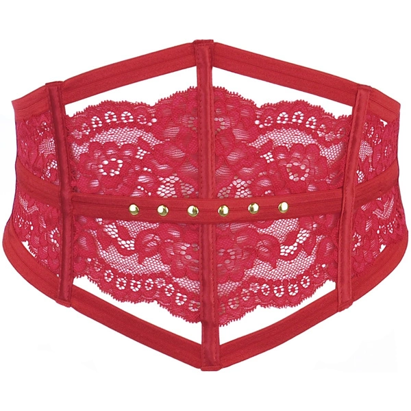 Кружевний червоний пояс з вбудованими бічними та середніми кісточками надзвичайно прикрашає та доповнює комплект V-9771,9778, створюючи ансамбль, від якого неможливо відірвати погляд. Засліплюйте унікальним набором у відтінку глибокого червоного. Модель має заклепки золотого кольору в середній частині, з задньої сторони потрійні еластичні стрічки з'єднують дворядну гачкову застібку.