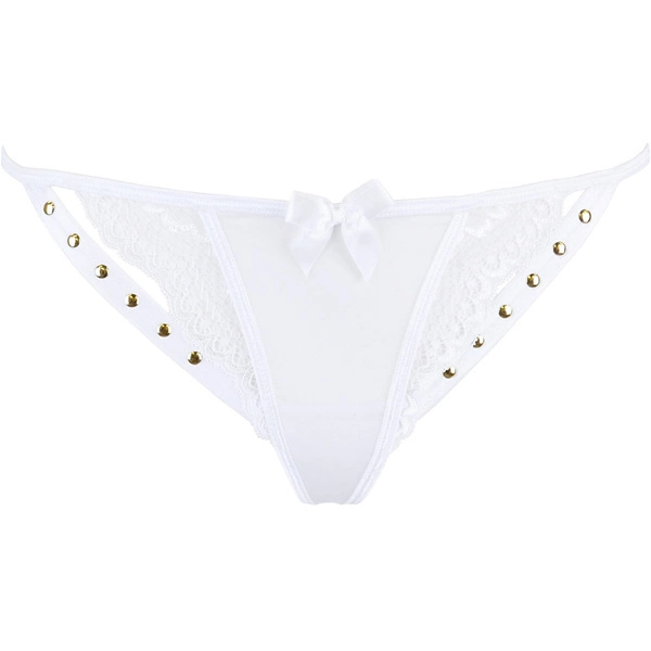 Модель, що привертає увагу своїм малюнком спереду та багатством золотих шипів, запрошує до чуттєвих відкриттів… Прекрасно вирізана мережива підкреслить красу твого тіла, особливо якщо ти також обереш бюстгальтер V-9791!
