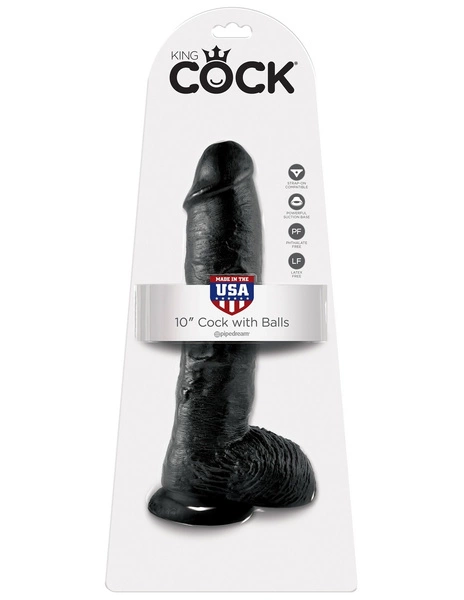 King Cock 10” Чоловічий член з яєчками чорного кольору – це ділдо з яєчками та присоскою. Гаджет виглядає як справжній пеніс. Особливу увагу заслуговує унікальний вигляд ділдо – точно відтворено структуру вен, форму, пропорції та головку. Завдяки цьому ви отримуєте враження, що нагадують справжній секс. Потужна та надійна присоска тримається на будь-якій плоскій поверхні, що дозволяє вам насолоджуватися ділдо без використання рук. Весь виріб виготовлено з безпечного та гіпоалергенного вінілового матеріалу (без фталатів і латексу). Гаджет виготовлено в США.