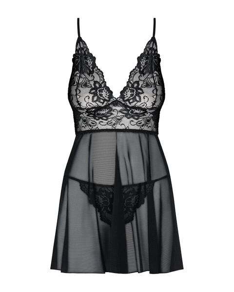 Idillia – це ніжний і елегантний комплект, що складається з легкого бабідолу та підібраних стрінгів. Прозорий, м'яко драпіруючий матеріал чуттєво спадає на стегна, створюючи ніжний і романтичний ефект. Верхня частина привертає увагу завдяки акуратно обробленому мереживу з рослинним візерунком, яке красиво підкреслює бюст. Стрункі бретелі, що оголюють спину, додають легкості та елегантності всьому образу.