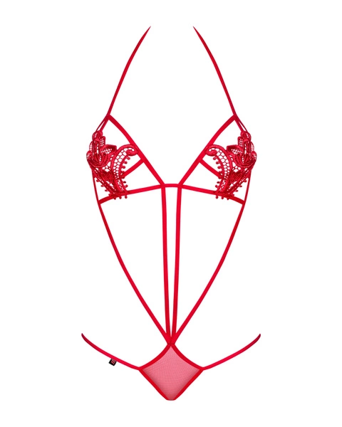 Obsessive Luiza to zmysłowe body zaprojektowane dla kobiet, które lubią eksponować swoje atuty w elegancki, ale odważny sposób. Model wykonano z bogato zdobionej gipiury, uzupełnionej o sprężyste paseczki, które oplatają sylwetkę, tworząc intrygującą kompozycję i optycznie wysmuklając figurę.
