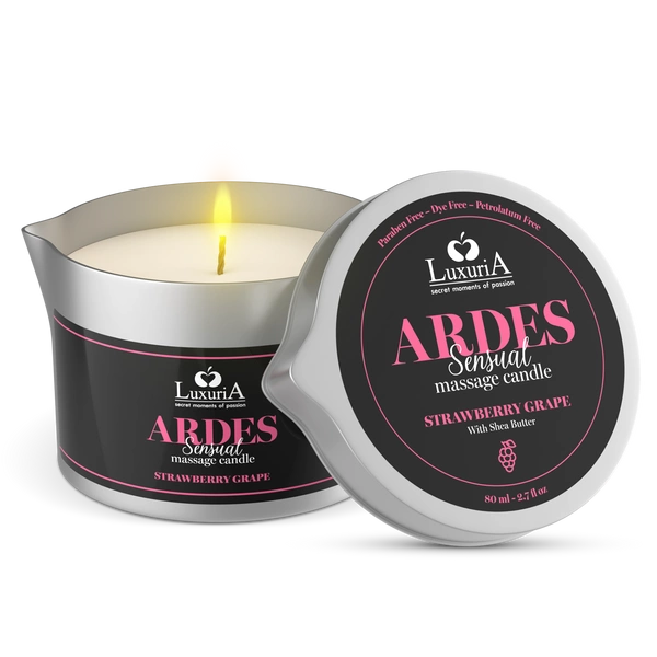 Luxuria Ardes Масажна свічка Полуниця-Виноград — це незвичайна масажна свічка, яка поєднує чуттєвий аромат, натуральний догляд та задоволення дотику в одне незабутнє враження. Після запалення свічки масло ши повільно розплавляється, створюючи теплий, шовковистий олій, ідеальний для розслабляючого та стимулюючого масажу тіла.